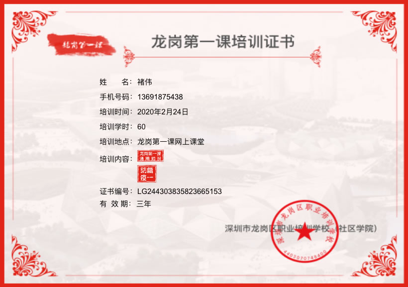 2019年2月24日,為減少接觸,公司組織全體員工在自己手機(jī)上關(guān)注“龍崗第一課學(xué)習(xí)平臺(tái)”,自行網(wǎng)上學(xué)習(xí)“龍崗第一課”通用知識(shí)篇和防疫篇一,并取得電子證書。