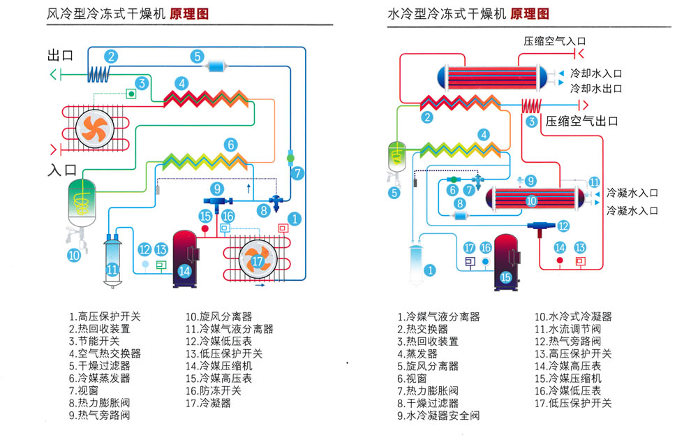 壓縮空氣是所有工業(yè)領(lǐng)域和技術(shù)生產(chǎn)過程中不可缺少的操作和加工動力。為防止生產(chǎn)過程中出現(xiàn)停工,壓縮空氣必須清潔、干燥且不含油。壓縮空氣是通過將大量的環(huán)境空氣增壓得到的。通常情況下,此類空氣中含有一些有害物質(zhì),如臟的顆粒物質(zhì)和水蒸氣形式存在的濕氣。形成有害的腐蝕性乳濁液,導(dǎo)致設(shè)備停止運(yùn)行,造成不可避免的巨大損失。進(jìn)入干燥機(jī)的壓縮空氣通過外流的冷壓縮空氣在“空氣一空氣”換熱器中預(yù)冷。然后,經(jīng)過預(yù)冷的空氣流經(jīng)“制冷劑一空氣”換熱器,進(jìn)下一步冷卻至需要的露點(diǎn)溫度。壓縮空氣中的濕氣凝結(jié)成水滴,并被自動收集和排放。處理后的千燥壓縮空氣與重新進(jìn)入的濕熱壓縮空氣在“空氣一空氣”的換熱器中二次交換升溫后進(jìn)入用氣管道。這樣既可以防止用氣管道結(jié)露,又節(jié)約了能源減輕機(jī)器的負(fù)荷。