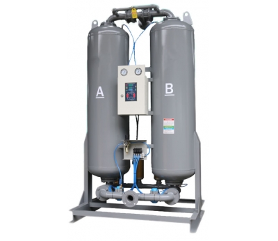無(wú)熱再生吸附式干燥機(jī)以變壓吸附為基礎(chǔ),在混合組分中的水蒸氣高分壓時(shí)吸附劑吸附水分,而在水蒸氣低分壓環(huán)境中,吸附劑中所吸附的水分完成“解吸”并重返氣相,吸附劑因此而獲得活性再生。無(wú)熱再生干燥機(jī)所用的低分壓解吸空氣取自本機(jī)輸出的一部分成品氣,再生氣與成品氣同源給無(wú)熱再生吸附式干燥機(jī)帶來(lái)很大的便利,使其結(jié)構(gòu)變得十分簡(jiǎn)單,操作過(guò)程也很方便。在無(wú)熱再生工藝中,解吸氣不僅是再生所必需的能源,而且還兼作水蒸氣排出的截體。由于變壓吸附在一般情況下均視作等溫過(guò)程,所以無(wú)熱再生干燥機(jī)不需要另設(shè)冷卻工序,吸附劑的解吸與再生在無(wú)熱再生中是同步完成的。