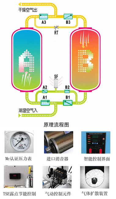 TSE露點(diǎn)節(jié)能控制(可選配置):TSE依據(jù)出口的干燥露點(diǎn)實(shí)行動(dòng)態(tài)的控制,測(cè)到吸附周期中的干燥塔未達(dá)飽和時(shí),將延長(zhǎng)其切換的周期,在保證穩(wěn)定露點(diǎn)同時(shí)更最大程度節(jié)省再生所需的耗氣量。可選配露點(diǎn)過(guò)高警報(bào)功能。