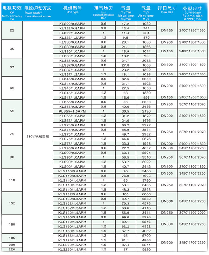 螺桿無(wú)油鼓風(fēng)機(jī)參數(shù)表